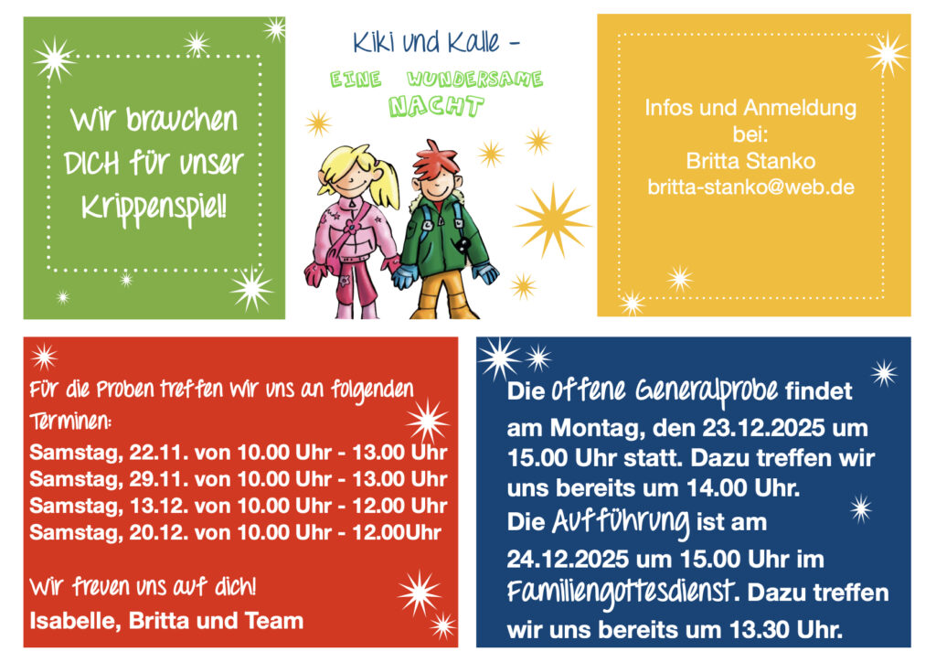 Die Probentage stehen bereits fest! Die Aufführung ist dann am 24.12.2025 um 15.00Uhr im Familiengottesdienst in der Markuskirche.
