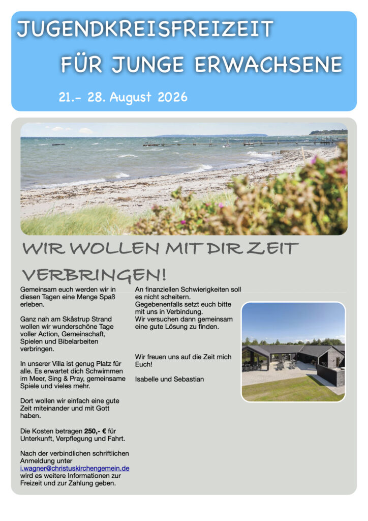Unser Jugendkreis fährt nach Dänemark und du kannst dabei sein! Sieben Tage gefüllt mit jeder Menge Action, Spaß und Gottes Wort. Nähere Infos gibt es hier!
