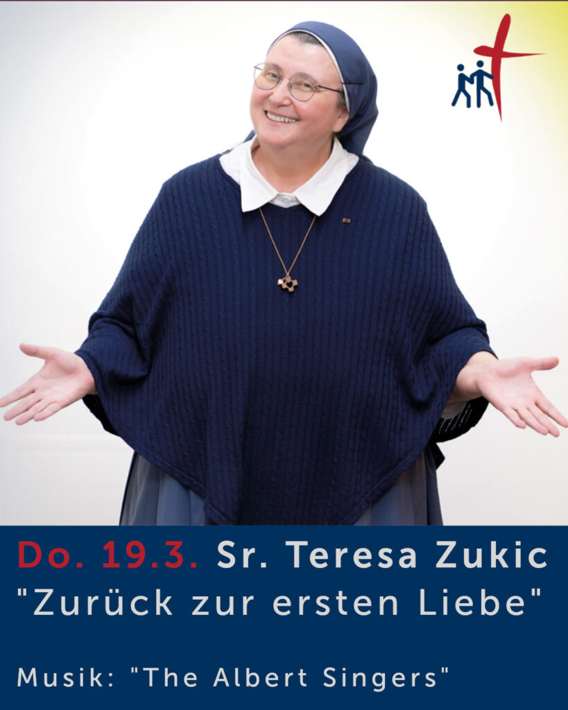 Do. 19.3. Schwester Teresa Zukic und „The Albert Singers“ Schwester Teresa ist kein unbeschriebens Blatt. Sie ist Millionen von Deutschen durch ihre Fernsehauftritte, Musicals, Gottesdienste, Vorträge, Predigten und Bücher bekannt. Als Dipl. Religionspädagogin, ist sie eine gefragte Gastrednerin in der ganzen Republik und nun auch international gefragt und macht seit Jahren als Manager- Trainerin Furore.