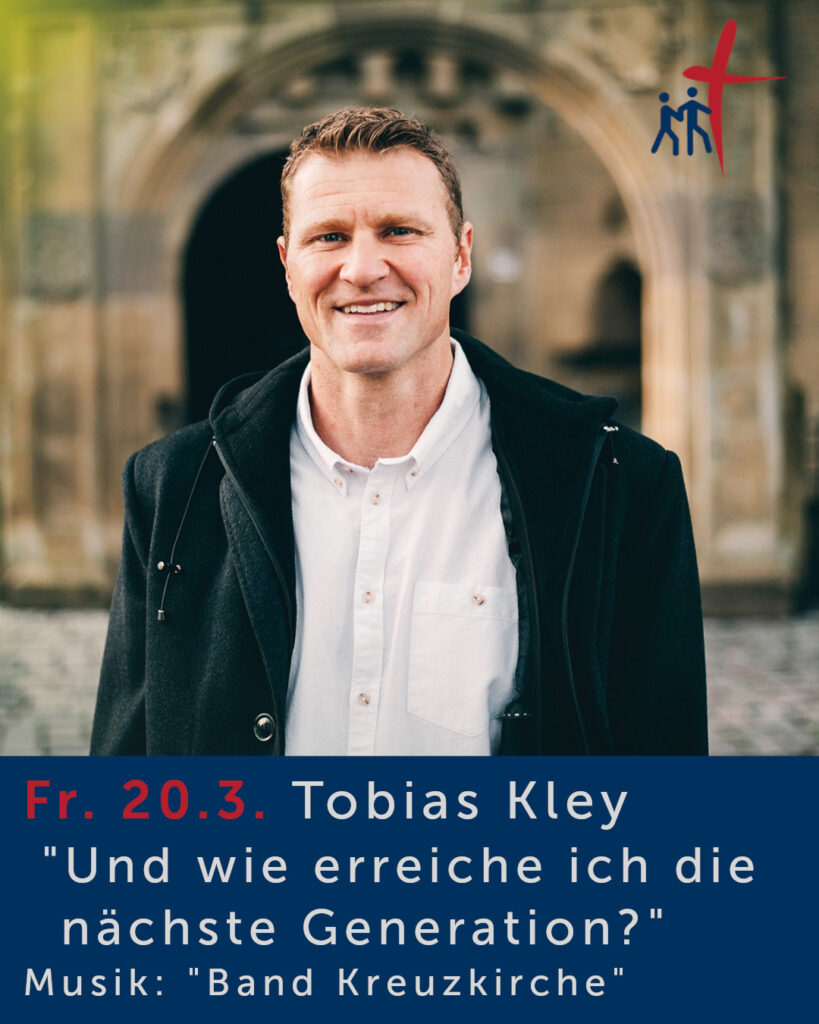 Fr. 20.3. Tobias Kley mit der Frage: „Und wie erreiche ich die nächste Generation?“ – Musik „Band Kreuzkirche“ Tobias Kleys Herz schlägt für junge Menschen. Als ehemaliger Zehnkämpfer und Boxer versuchte er den Sinn des Lebens im Sport zu finden. In Jesus Christus hat der heutige Evangelist und Prediger seine Lebenserfüllung gefunden. Als ausgebildeter Erlebnispädagoge liebt er es, andere herauszufordern und von seinen Begegnungen mit dem lebendigen Gott zu erzählen. In seinem Herzensprojekt creedle.io sieht er die Möglichkeit, unzählige Menschen dort mit dem Evangelium zu erreichen, wo sie wirklich suchen – online. Gemeinsam mit vielen Anderen betet er für eine „digitale Reformation“.